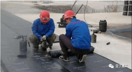 平面施工:先把卷材按位置摆正,留出搭接尺寸,将铺贴卷材的基准线弹好,按此基准线进行卷材铺贴施工。点燃喷灯(喷灯距卷材0.3-0.5m左右),用喷灯加热卷材和基层,待卷材表面熔化后随即向前滚铺,用胶辊用力向前、向两侧滚压,排出空气。注意加热要均匀,滚压时不要卷入空气和异物,要求压实、压平。卷材粘贴时,不得拉伸。